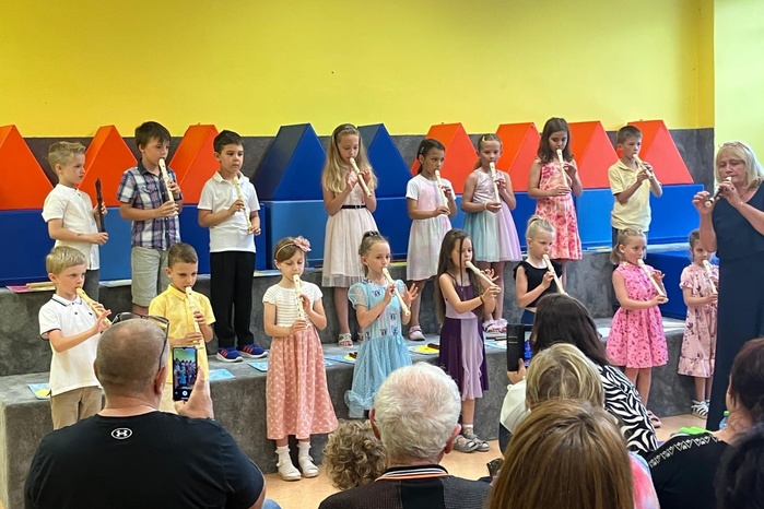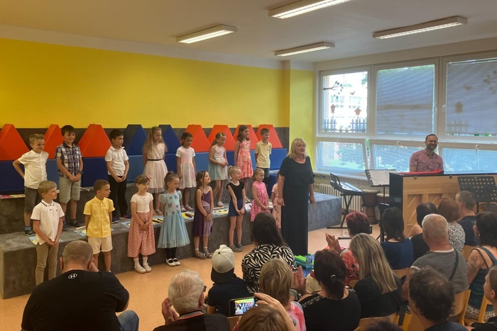 Žáci a žákyně z hudební třídy 1. B pod vedením pana učitele Tomáše Mičky a paní učitelky Lenky Smělíkové uspořádali ve středu 18. června letní koncert, kterým slavnostně otevřeli novou hudebnu. Koncertu se zúčastnilo mnoho hostů z řad rodinných příslušníků dětí i pedagogického sboru.