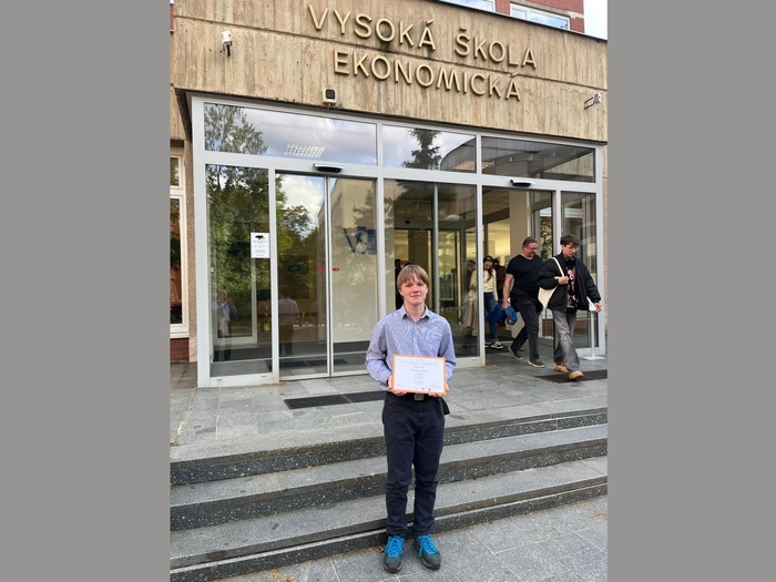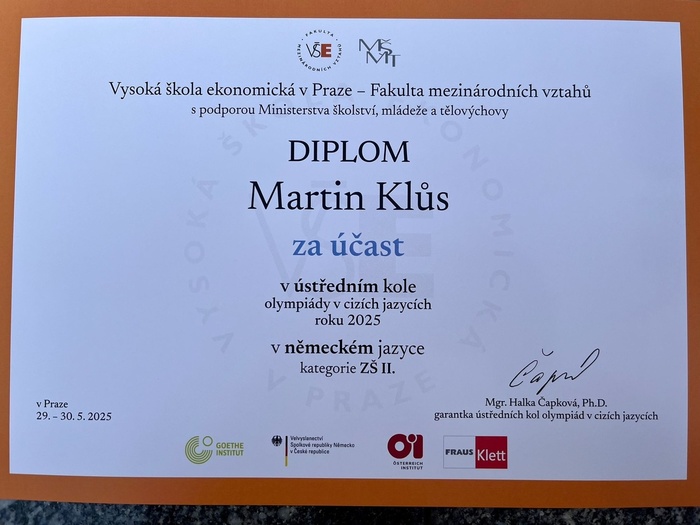 Dne 29. 5. se konalo na Fakultě mezinárodních vztahů VŠE v Praze ústřední (celostátní) kolo Olympiády cizích jazyků. Naši školu a také celý Moravskoslezský kraj v něm reprezentoval žák třídy 9. B Martin Klůs, který se v dubnu stal vítězem krajského kola Olympiády v německém jazyce. Martin se utkal v kategorii ZŠ II. s 13 dalšími vítězi krajských kol z celé republiky v konverzačních disciplínách jako je představení se, interaktivní rozhovor s porotou, úvaha nad zadaným tématem či obrázkem. Soutěžící museli také prokázat svou schopnost pohotově reagovat na nečekané otázky poroty i mimo vylosovaná témata. Martin v této vysoké konkurenci získal krásné 7. místo.
