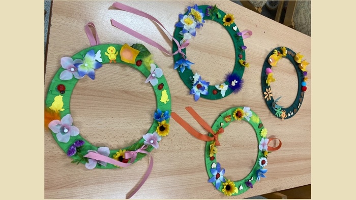 K zavěšení na dveře, do okna nebo do interiéru, nazdobený drobnými jarními dekoracemi. Co budete potřebovat - věneček bez ozdob, umělé květy různých tvarů i barev, umělé zelené rostlinky, tavící pistoli, ozdobnou stužku…a máte hotovo - doma na vás dýchne hned jaro. Všem dětem se věnečky moc povedly a určitě udělaly doma velkou radost.